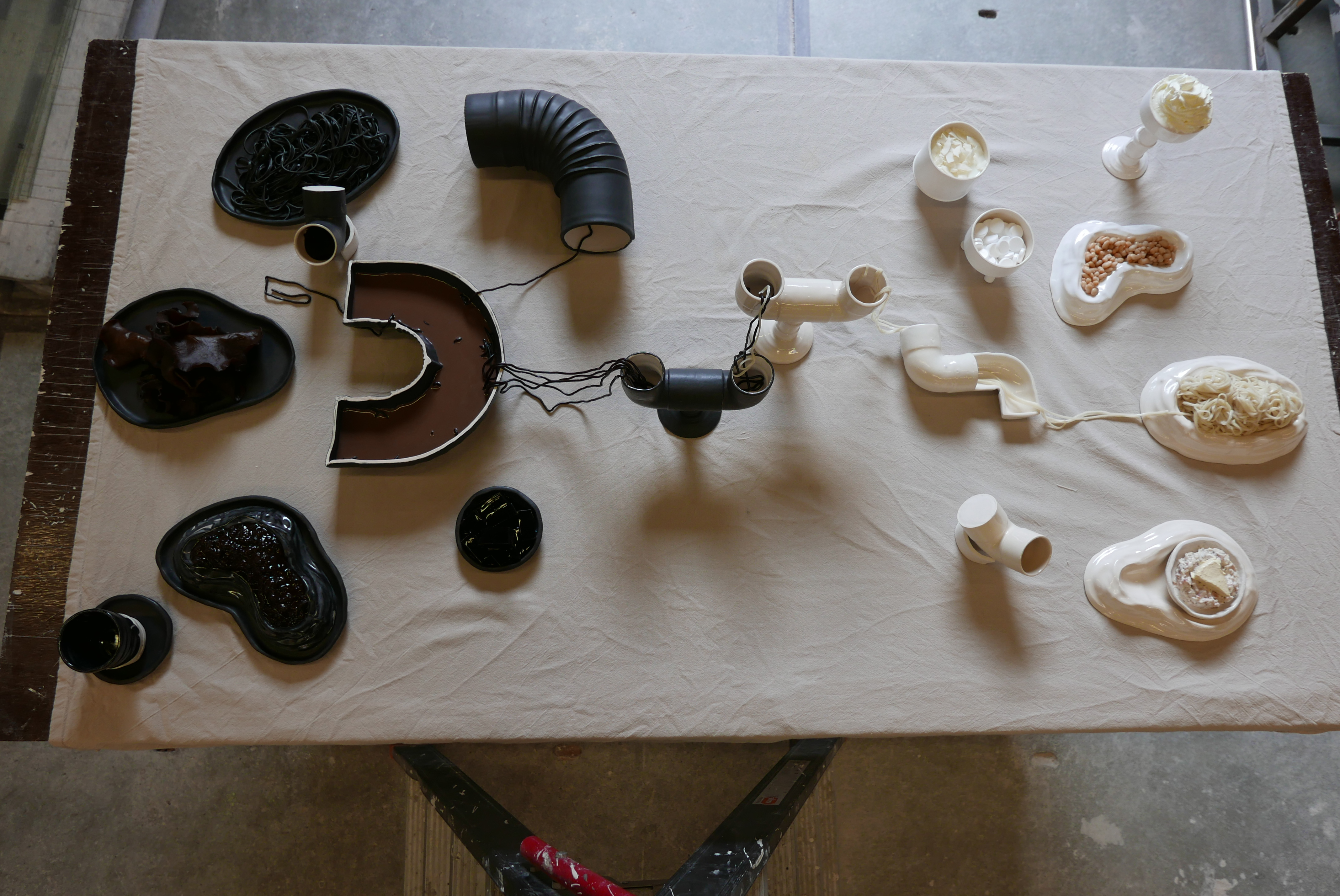 The diners are made to connect through the dinnerware pieces. The white and black colour palette was chosen to draw the viewer’s eye to the connectors: the ceramic pieces. The title was chosen to showcase the disjointed, individualistic communication that is characteristic for the West, but that is also now representative of the global policy moving toward social isolation.